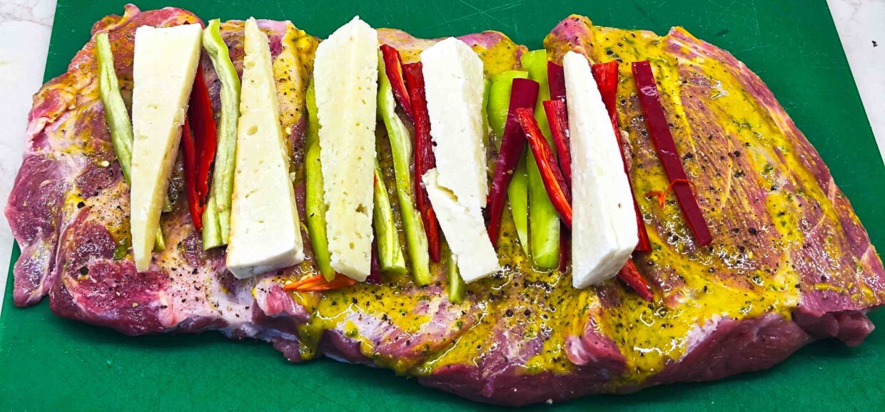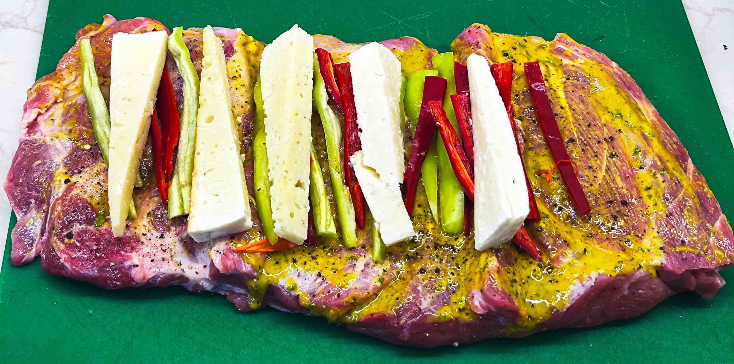 Απλώνουμε κατά μήκος τις πιπεριές, και το κεφαλοτύρι και γυρίζουμε την άκρη του χοιρινού σχηματίζοντας ένα ρολό.