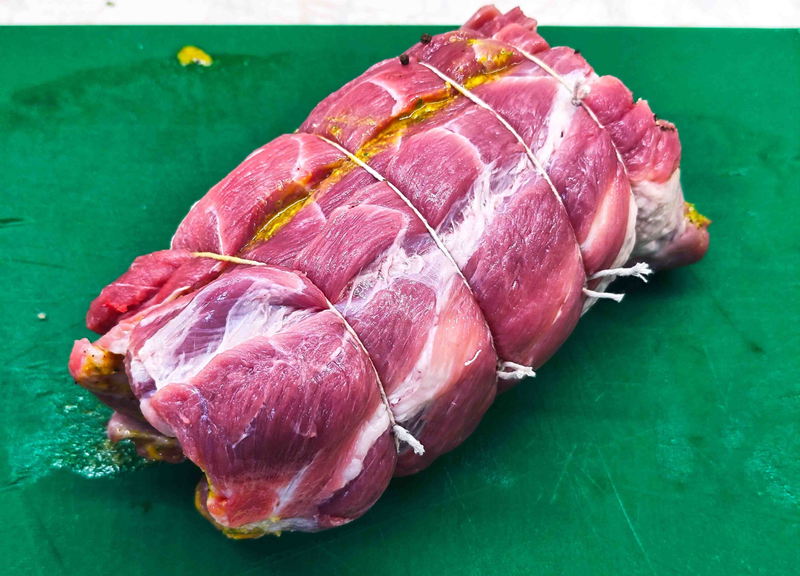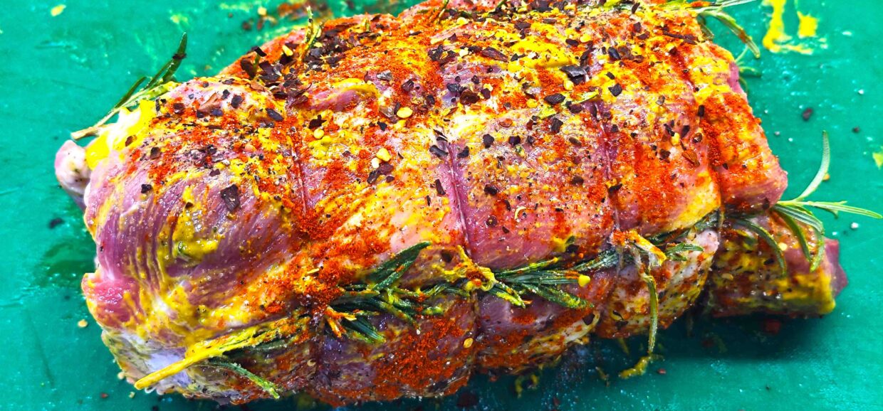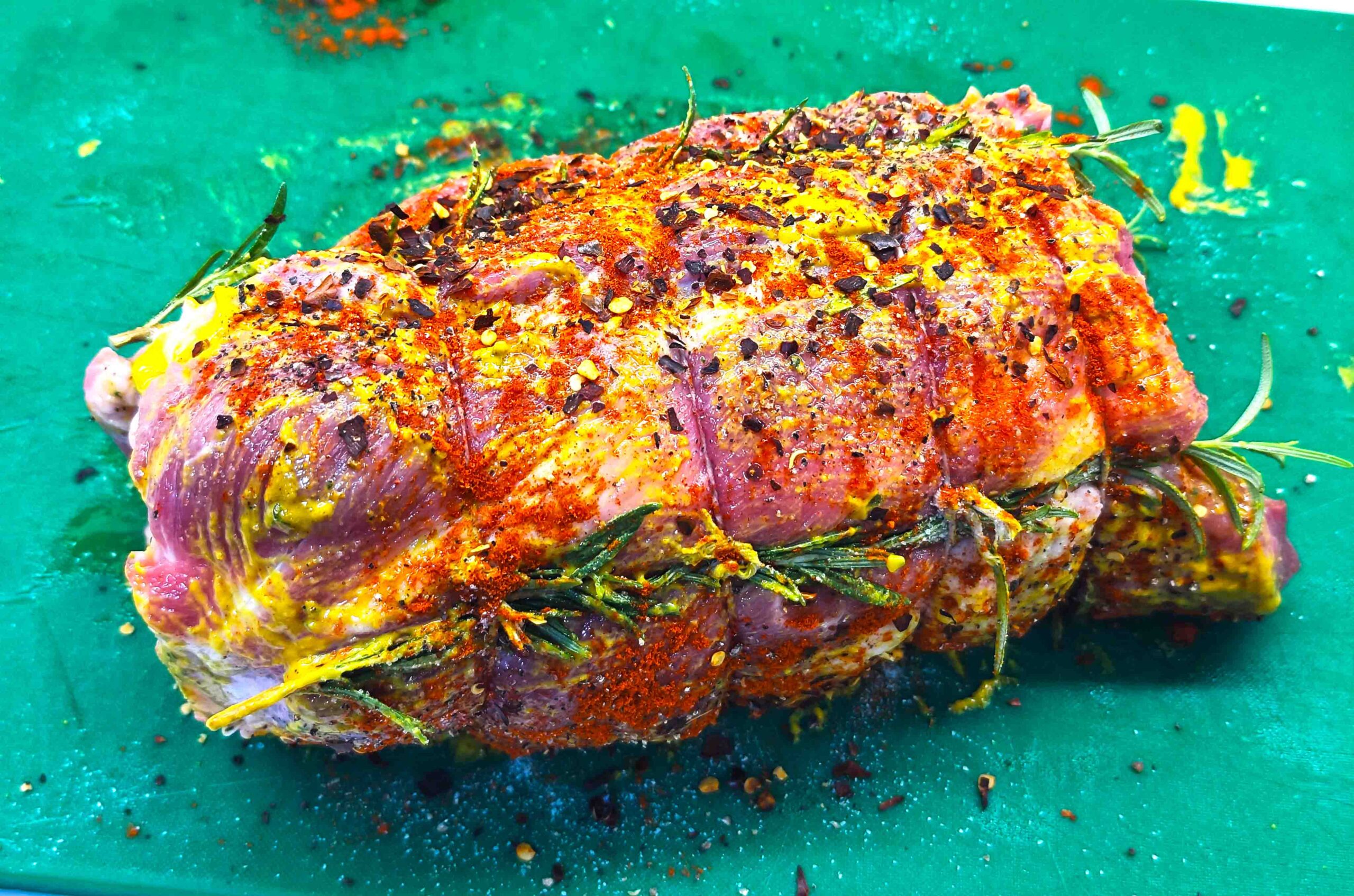 Αλείφουμε το ρολό με μουστάρδα, πασπαλίζουμε με πάπρικα καπνιστή, μαύρο φρεσκοτριμμένο πιπέρι, μπόυκοβο γλυκό και αλάτι.