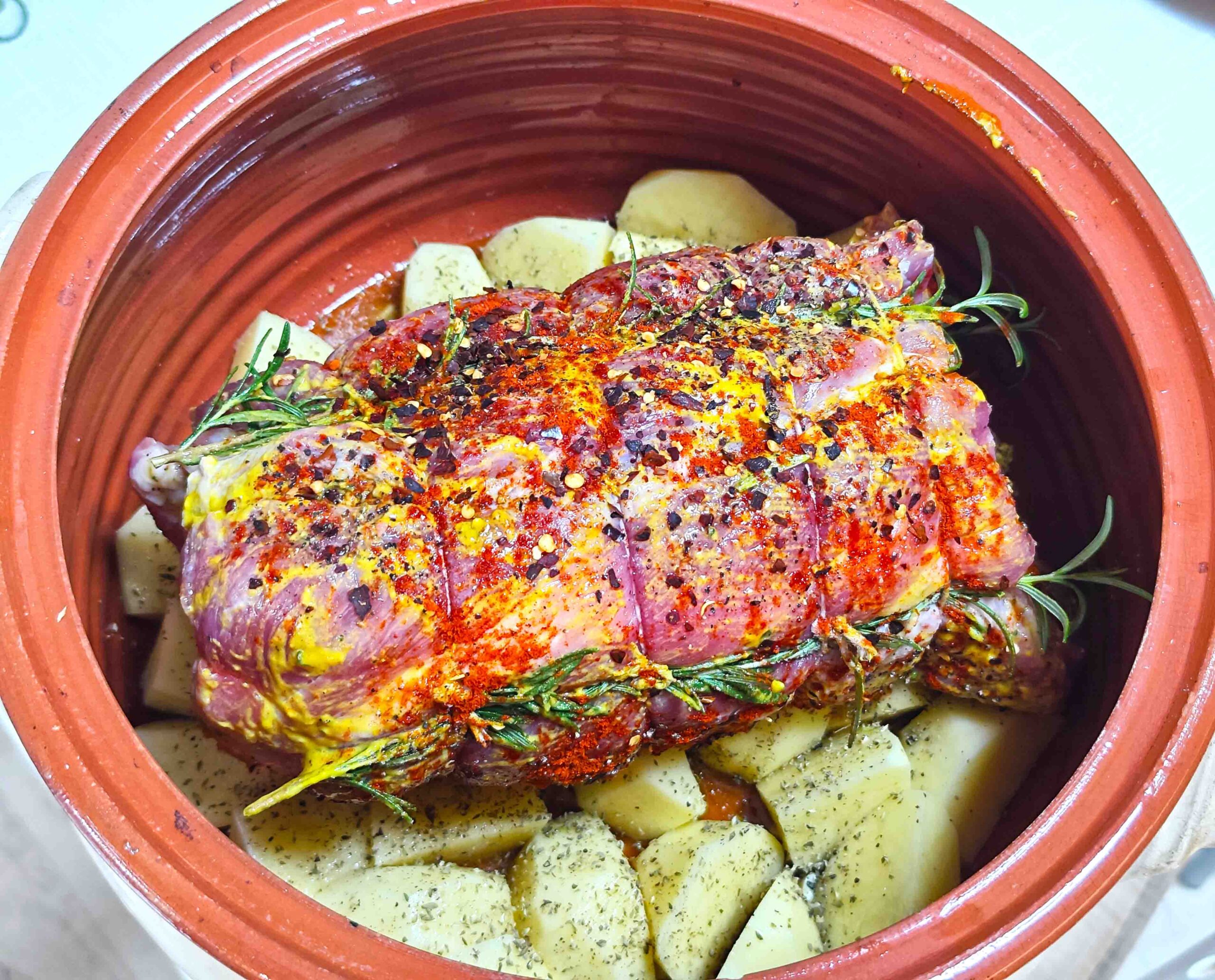 Χοιρινός λαιμός ρολό με πατάτες στη γάστρα